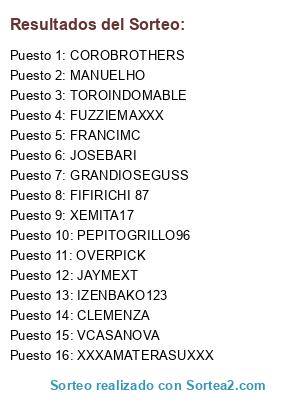 Lista de participantes: PAKIU, LOBITO, CRACKDOWN, NARANJITO, DOCTOR PRO, MANUELHO, BARICELLI, MIJAIL BAKUNIN, PEPITOGRILLO, IZENBAKO, OVERPICK, TENZORSPAIN, TORETE, FRANCI, GUSS, POLINY.