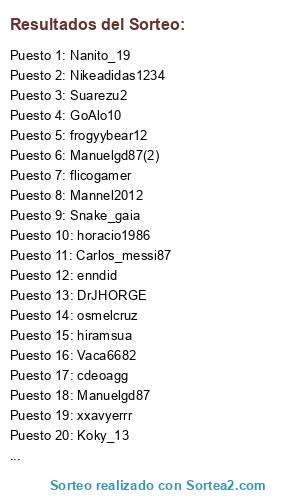 Lista de participantes: horacio1986, cdeoagg, ed_castro, ismaclo, osmelcruz, Manuelgd87, hiramsua, Kevinfireu3, DrJHORGE, frogyybear12, Suarezu2, Nikeadidas1234, Jordinodino, Nanito_19, Carlos_messi87, Danyskalera, Vaca6682, flicogamer, Koky_13, CARNILOKOZ, Manuelgd87(2), Manuelgd87(3), Crojas10_reload, AZULCREMAQUERIDO, Andry_pumas, xxavyerrr, GoAlo10, nemesisrvf, Snake_gaia, Mannel2012, Suarezu2(2), enndid.