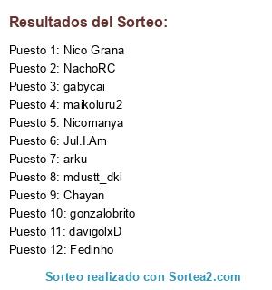 Lista de participantes: gabycai, Chayan, Jul.I.Am, davigolxD, mdustt_dkl, gonzalobrito, NachoRC, Nicomanya, arku, maikoluru2, Nico Grana, Fedinho.