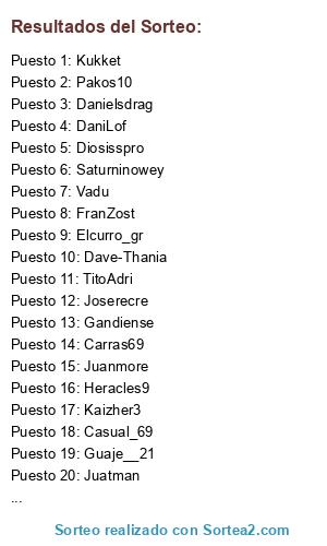 Lista de participantes: Carras69, Elfus21, Dave-Thania, GoNcIII, Sant7Fut, Guaje__21, Borregos, Borregos jr, Danielsdrag, Elcurro_gr, TitoAdri, Pakos10, Manuu18, Heracles9, Pirichi_N_1, Maoloth, DaniLof, Titoborre, Regu-Cocker20, Joserecre, Kskls, Kukket, Pascky85, Ximeti, Gandiense, Zupolev, Saturninowey, Robbiee77, AcidCold, Juanmore, Sarrac, FranZost, Juatman, Diosisspro, Vadu, Gusgranota, Llou235, Hugotevic, Kaizher3, Estevehnos, Garban_canarion, Casual_69, Toper85, AmaroM72, Rlgdsr, Gagxi, Doreri, ToseManu.