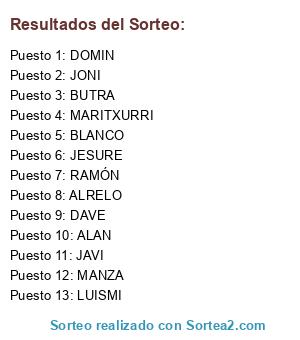 Lista de participantes: MANZA, RAMÓN, ALAN, DAVE, JESURE, BLANCO, JONI, ALRELO, BUTRA, LUISMI, MARITXURRI, JAVI, DOMIN.
