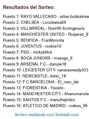 Lista de participantes: BOCA JUNIORS - masogo_6, ATLETICO DE MADRID - crakes_99, CHELSEA - Locobielsa89, LEICESTER CITY- nanerasready033, SANTOS F.C - manuthejimbo, PSG - mickybl4ck, RAYO VALLECANO - arber-bukkakrew, NEWCASTLE- danic_18, MANCHESTER UNITED - Ruiperez_87, ARSENAL F.C - darupe18, MANCHESTER CITY - Alvaromanoteras, FIORENTINA - Yooeric-, BENFICA - FranMoronta, VILLARREAL - NoxHR-Scrimgeours, JUVENTUS - rockiie10, F.C BARCELONA - El_ruso_tito.