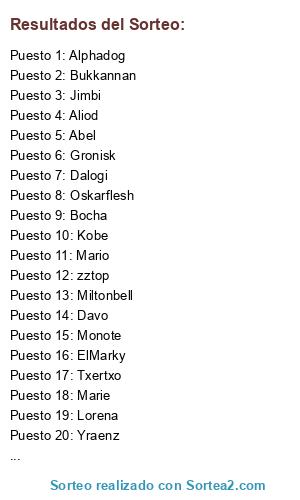 Lista de participantes: Marie, zztop, Miltonbell, Renko, Dalogi, ElMarky, Jimbi, Bocha, Bukkannan, Nobi, Alphadog, wDvDw, Kobe, Aliod, Oskarflesh, Fernandisco, Corrup, Davo, Mario, Verssetty, Nobodysaid, Monote, Caniggia, Lorena, Farenheit, Txertxo, Abel, Gronisk, Rojinu, Yraenz.