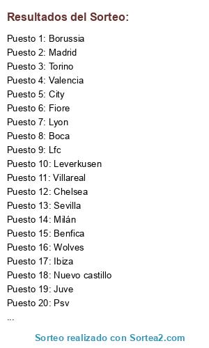 Lista de participantes: Ibiza, Fiore, Milán, United, Madrid, Inter, Torino, Chelsea, Benfica, City, Borussia, Juve, PSG, Lfc, Wolves, Psv, Leverkusen, Valencia, Lyon, Ajax, Sevilla, Nuevo castillo, Boca, Villareal.