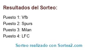 Lista de participantes: Vfb, LFC, Spurs, Milan.