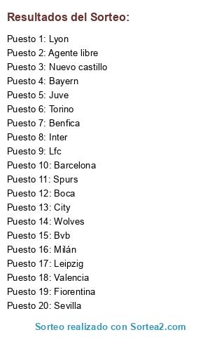 Lista de participantes: Barcelona, Bayern, Milán, Torino, City, Boca, Juve, Spurs, Sevilla, Lyon, Nuevo castillo, Lfc, Wolves, Valencia, Fiorentina, Inter, Leipzig, Bvb, Benfica, Agente libre.