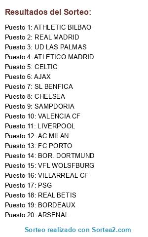 Lista de participantes: ATLETICO MADRID, SAMPDORIA, BORDEAUX, REAL MADRID, VALENCIA CF, ATHLETIC BILBAO, REAL BETIS, CHELSEA, BOR. DORTMUND, FC PORTO, PSG, UD LAS PALMAS, VILLARREAL CF, VFL WOLSFBURG, LIVERPOOL, SL BENFICA, ARSENAL, AC MILAN, CELTIC, AJAX.