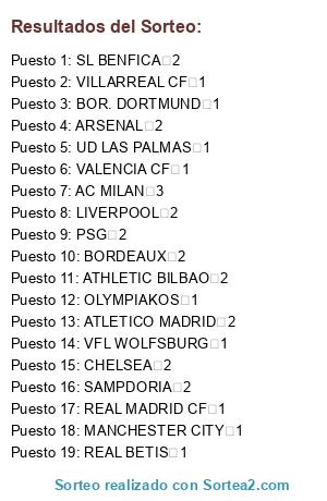 Lista de participantes: AC MILAN 3, ARSENAL 2, ATHLETIC BILBAO 2, ATLETICO MADRID 2, BOR. DORTMUND 1, BORDEAUX 2, CHELSEA 2, LIVERPOOL 2, MANCHESTER CITY 1, OLYMPIAKOS 1, PSG 2, REAL BETIS 1, REAL MADRID CF 1, SAMPDORIA 2, SL BENFICA 2, UD LAS PALMAS 1, VALENCIA CF 1, VFL WOLFSBURG 1, VILLARREAL CF 1.