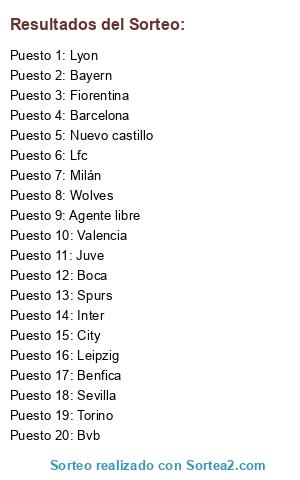 Lista de participantes: Barcelona, Bayern, Milán, Torino, City, Boca, Juve, Spurs, Sevilla, Lyon, Nuevo castillo, Lfc, Wolves, Valencia, Fiorentina, Inter, Leipzig, Bvb, Benfica, Agente libre.