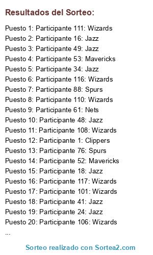 Lista de participantes: Participante 1: Clippers, Participante 2: Clippers, Participante 3: Clippers, Participante 4: Clippers, Participante 5: Clippers, Participante 6: Clippers, Participante 7: Clippers, Participante 8: Clippers, Participante 9: Clippers, Participante 10: Clippers, Participante 11: Clippers, Participante 12: Clippers, Participante 13: Clippers, Participante 14: Clippers, Participante 15: Jazz, Participante 16: Jazz, Participante 17: Jazz, Participante 18: Jazz, Participante 19: Jazz, Participante 20: Jazz, Participante 21: Jazz, Participante 22: Jazz, Participante 23: Jazz, Participante 24: Jazz, Participante 25: Jazz, Participante 26: Jazz, Participante 27: Jazz, Participante 28: Jazz, Participante 29: Jazz, Participante 30: Jazz, Participante 31: Jazz, Participante 32: Jazz, Participante 33: Jazz, Participante 34: Jazz, Participante 35: Jazz, Participante 36: Jazz, Participante 37: Jazz, Participante 38: Jazz, Participante 39: Jazz, Participante 40: Jazz, Participante 41: Jazz, Participante 42: Jazz, Participante 43: Jazz, Participante 44: Jazz, Participante 45: Jazz, Participante 46: Jazz, Participante 47: Jazz, Participante 48: Jazz, Participante 49: Jazz, Participante 50: Mavericks, Participante 51: Mavericks, Participante 52: Mavericks, Participante 53: Mavericks, Participante 54: Mavericks, Participante 55: Mavericks, Participante 56: Mavericks, Participante 57: Mavericks, Participante 58: Mavericks, Participante 59: Nets, Participante 60: Nets, Participante 61: Nets, Participante 62: Nets, Participante 63: Nets, Participante 64: Nets, Participante 65: Nets, Participante 66: Nets, Participante 67: Nets, Participante 68: Nets, Participante 69: Nets, Participante 70: Spurs, Participante 71: Spurs, Participante 72: Spurs, Participante 73: Spurs, Participante 74: Spurs, Participante 75: Spurs, Participante 76: Spurs, Participante 77: Spurs, Participante 78: Spurs, Participante 79: Spurs, Participante 80: Spurs, Participante 81: Spurs, Participante 82: Spurs, Participante 83: Spurs, Participante 84: Spurs, Participante 85: Spurs, Participante 86: Spurs, Participante 87: Spurs, Participante 88: Spurs, Participante 89: TrailBlazers, Participante 90: TrailBlazers, Participante 91: TrailBlazers, Participante 92: TrailBlazers, Participante 93: TrailBlazers, Participante 94: TrailBlazers, Participante 95: TrailBlazers, Participante 96: TrailBlazers, Participante 97: TrailBlazers, Participante 98: Wizards, Participante 99: Wizards, Participante 100: Wizards, Participante 101: Wizards, Participante 102: Wizards, Participante 103: Wizards, Participante 104: Wizards, Participante 105: Wizards, Participante 106: Wizards, Participante 107: Wizards, Participante 108: Wizards, Participante 109: Wizards, Participante 110: Wizards, Participante 111: Wizards, Participante 112: Wizards, Participante 113: Wizards, Participante 114: Wizards, Participante 115: Wizards, Participante 116: Wizards, Participante 117: Wizards, Participante 118: Wizards, Participante 119: Wizards, Participante 120: Wizards.