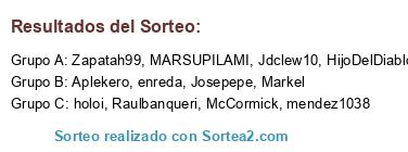 Lista de participantes: Zapatah99, MARSUPILAMI, HijoDelDiablo, Jdclew10, Raulbanqueri, Aplekero, Josepepe, enreda, holoi, mendez1038, McCormick, Markel.