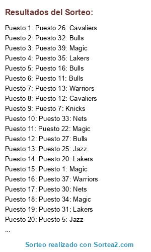 Lista de participantes: Puesto 1: Magic, Puesto 2: Lakers, Puesto 3: Warriors, Puesto 4: Nets, Puesto 5: Jazz, Puesto 6: Cavaliers, Puesto 7: Knicks, Puesto 8: Lakers, Puesto 9: Nets, Puesto 10: Lakers, Puesto 11: Bulls, Puesto 12: Cavaliers, Puesto 13: Warriors, Puesto 14: Knicks, Puesto 15: Bulls, Puesto 16: Bulls, Puesto 17: Nets, Puesto 18: Lakers, Puesto 19: Knicks, Puesto 20: Lakers, Puesto 21: Jazz, Puesto 22: Magic, Puesto 23: Lakers, Puesto 24: Jazz, Puesto 25: Jazz, Puesto 26: Cavaliers, Puesto 27: Bulls, Puesto 28: Warriors, Puesto 29: Bulls, Puesto 30: Nets, Puesto 31: Lakers, Puesto 32: Bulls, Puesto 33: Nets, Puesto 34: Magic, Puesto 35: Lakers, Puesto 36: Knicks, Puesto 37: Warriors, Puesto 38: Warriors, Puesto 39: Magic, Puesto 40: Lakers.
