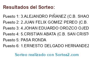 Lista de participantes: 1.ERNESTO DELGADO HERNANDEZ (C.B. MONTEOLIVETE), 2.JUAN FELIX GOMEZ PEREO (C.B. ELCHE), 3.ALEJANDRO PIÑANEZ (C.B. SHAOLIN), 4.JOHAN EDUARDO OROZCO OJEDA (C.B. SAN CRISTOBAL), 5.CRISTIAN ABATA (C.B. SAN CRISTOBAL), PASA RONDA.