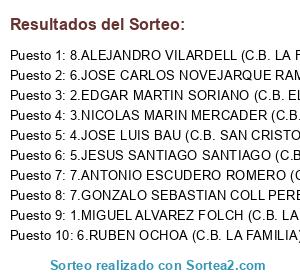 Lista de participantes: 1.MIGUEL ALVAREZ FOLCH (C.B. LA UNION), 2.EDGAR MARTIN SORIANO (C.B. ELCHE), 3.NICOLAS MARIN MERCADER (C.B. PINEL), 4.JOSE LUIS BAU (C.B. SAN CRISTOBAL), 5.JESUS SANTIAGO SANTIAGO (C.B. OLIVARES), 6.JOSE CARLOS NOVEJARQUE RAMIREZ (C.B. TRAINNING UNIT), 7.ANTONIO ESCUDERO ROMERO (C.B. VILA-REAL), 8.ALEJANDRO VILARDELL (C.B. LA FAMILIA), 6.RUBEN OCHOA (C.B. LA FAMILIA), 7.GONZALO SEBASTIAN COLL PEREZ (C.B. MARTINEZ).