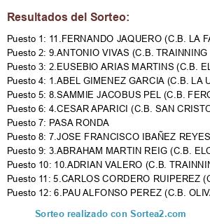 Lista de participantes: 1.ABEL GIMENEZ GARCIA (C.B. LA UNION), 2.EUSEBIO ARIAS MARTINS (C.B. ELCHE), 3.ABRAHAM MARTIN REIG (C.B. ELCHE), 4.CESAR APARICI (C.B. SAN CRISTOBAL), 5.CARLOS CORDERO RUIPEREZ (C.B. OLIVARES), 6.PAU ALFONSO PEREZ (C.B. OLIVARES), 7.JOSE FRANCISCO IBAÑEZ REYES (C.B. SEDAVI), 8.SAMMIE JACOBUS PEL (C.B. FEROZ), 9.ANTONIO VIVAS (C.B. TRAINNING UNIT), 10.ADRIAN VALERO (C.B. TRAINNING UNIT), 11.FERNANDO JAQUERO (C.B. LA FAMILIA), PASA RONDA.