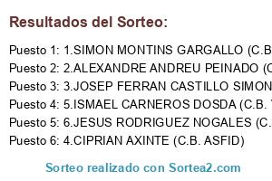 Lista de participantes: 1.SIMON MONTINS GARGALLO (C.B. LA UNION), 2.ALEXANDRE ANDREU PEINADO (C.B. ON GUARDAMAR), 3.JOSEP FERRAN CASTILLO SIMON (C.B. PEDRALBA), 4.CIPRIAN AXINTE (C.B. ASFID), 5.ISMAEL CARNEROS DOSDA (C.B. VILA-REAL), 6.JESUS RODRIGUEZ NOGALES (C.B. VILA-REAL).