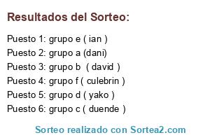 Lista de participantes: grupo a (dani), grupo b ( david ), grupo c ( duende ), grupo d ( yako ), grupo f ( culebrin ), grupo e ( ian ).