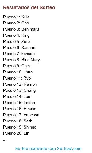 Lista de participantes: K', Maxima, Ramon, Vanessa, Benimaru, Shingo, Lin, Seth, Terry, Andy, Joe, Blue Mary, Ryo, Robert, King, Takuma, Leona, Ralf, Clark, Whip, Athena, kensou, Chin, Bao, Mai, Yuri, Kasumi, Hinako, Kim, Chang, Choi, Jhun, Kyo, Iori, Kula, Zero.