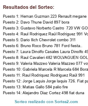 Lista de participantes: Valeria Mazzeo Valeria Mazzeo 077 voyage, Gabriela Marcela R Marcela 684 Bora, Raul Cavalieri 482 WOLVAGUEN GOL, Alejandro Diaz Cortez 498 fiat duna, Laura Dinolfo Casales Laura Dinolfo 492 Celta, Dario Ilich Chevrolet combo 311, Raul Rodriquez Raúl Rodriguez 991 Voyage, Raul Rodriquez Rodriguez Raúl 991, Matias Gallo 584 palio fire, Jorge Laquis Jorge laquis 726. Fiat palio, Davo Thune David 897 bora, Bruno Roco Bruno 781 Ford fiesta.., Hernan Guzman 223 Renault megane, Gustavo Norberto Castro 720 VW GOL TREND.
