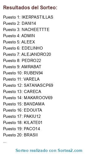 Lista de participantes: ADMIN, PEDRO22, IKERPASTILLAS, ALEJANDRO20, EDELINHO, ALEEX, BRASII, NACHEETTTE, RUBINHO, PACO14, MAGUS123, SATANASCP69, RUBEN94, KILATE01, PAKIU12, MAKAROOV69, BANDAMA, CARECA, VARELA, AMRABAT, DANI14, EDOUITA, ALFAROJUNIOR.