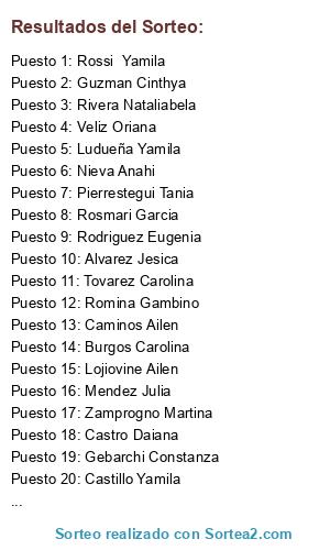Lista de participantes: Lujan Lucila Abigail, Romina Gambino, Emilia Musso, Bardelli Fiorela, Scauso Elita, Mattos Catalina, Sucaria Paula, Dominguez Sabrina, Vrech Solange, Rosmari Garcia, Ponce Belen, Lucero Palacios, Sanchez Sofia Ines, Caporal Luciana, Pierrestegui Tania, Schaff Antonella, Guevara Celena, Hernandez Alejandra, Perez Noelia, Bons Martinez Edna Agostina, Chavez Paola, Rodriguez Eugenia, Lojiovine Ailen, Cali Agostina, Fabrie Vanesa, Teruel Dorana, Fernandez Noelia, Contreras Melisa, Tovarez Carolina, Zamprogno Martina, Tertellbaum Ana Clara, Serruya Emilia, Castillo Yamila, Molina Rocio, Almaraz Camila, Beltran Ginesa, Castro Daiana, Alzama josefina, Vidal Lucia, Fernandez Jesica, Funes Milena, Mercad Florencia, Bietti Valentina, Nieva Anahi, Veliz Oriana, Omeñuka Yessica, Nazer Maria Emilia, Burgos Carolina, Cufre Mayra, Sambrini Noelia, Benitez Fiorella, Alvarez Jesica, Ayala Fernando, Bustamante Sharim, Portugues Lorena, Zalazar M. Alejandra, Morales Noelia, Pollo Melisa, Delima Laura, Barrientos Julia, García Paulina, Santiago Agostina, Quesada Yesica, Boj Caren, Romero Pierina, Rossi Yamila, Diaz Rocio, Dahir Agostina, Quispe Noelia, Ferraivolo Daiana, Arsaut Camila, Verganin Erica, Bodello Florencia, Cortassa Diana, Mendez Julia, Guzman Cinthya, Maldonado María Fernanda, Cisneros Nemecia, Imhoff Melania, Romo Pamela, Cherino Noelia, Gebarchi Constanza, Rodas Rocio, Stechina Patricia, Gorosito Celeste, Ludueña Yamila, Caminos Ailen, Inchaurrando Valeria, Gómez Fatima, Britos María Eugenia, Rivera Nataliabela, Rossi Jesica, Nerina Brenda, Manzato Brenda, Amenabar Sonia, Gonzalez Flavia, Brondetta Priscila, Villagra Valeria Belen, Lucero Vanesa, Aloy Rocio, Cot Rebeca, Mercado Florencia, Aniceto Daniela, Obelar Belen, Ochoa Florencia, Buralli Fanny, Caceres Debora, .