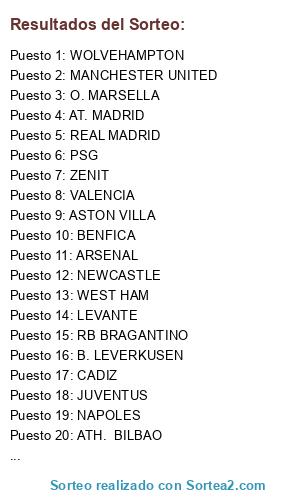 Lista de participantes: VALENCIA, LEVANTE, VENEZIA, ARSENAL, CHELSEA, ASTON VILLA, CHAPECOENSE, ATH. BILBAO, SCHALKE, TOTTENHAM, NEWCASTLE, WOLVEHAMPTON, JUVENTUS, S. DONETSK, REAL MADRID, RB BRAGANTINO, CADIZ, VILLARREAL, O. MARSELLA, BENFICA, AT. MADRID, NAPOLES, OPORTO, LAS PALMAS, MANCHESTER UNITED, AJAX, ZENIT, PSG, B. LEVERKUSEN, ROMA, WEST HAM, FIORENTINA.