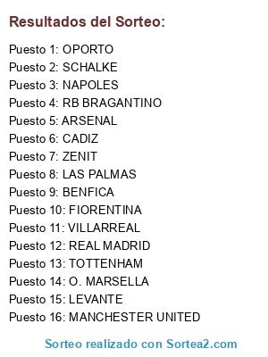 Lista de participantes: MANCHESTER UNITED, O. MARSELLA, REAL MADRID, ZENIT, BENFICA, ARSENAL, LEVANTE, RB BRAGANTINO, CADIZ, NAPOLES, SCHALKE, OPORTO, FIORENTINA, VILLARREAL, TOTTENHAM, LAS PALMAS.