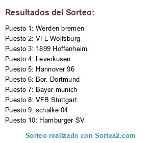 Lista de participantes: Bayer munich, Bor. Dortmund, Leverkusen, schalke 04, VFL Wolfsburg, Werden bremen, 1899 Hoffenheim, Hamburger SV, Hannover 96, VFB Stuttgart.