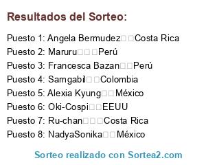 Lista de participantes: Samgabil Colombia, Angela Bermudez Costa Rica, Ru-chan Costa Rica, Oki-Cospi EEUU, Alexia Kyung México, NadyaSonika México, Francesca Bazan Perú, Maruru Perú.