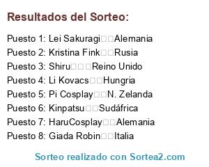 Lista de participantes: Pi Cosplay N. Zelanda, Kinpatsu Sudáfrica, HaruCosplay Alemania, Lei Sakuragi Alemania, Li Kovacs Hungria, Giada Robin Italia, Shiru Reino Unido, Kristina Fink Rusia.