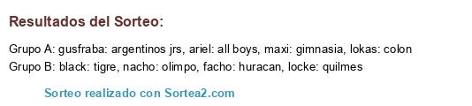 Lista de participantes: ariel: all boys, facho: huracan, gusfraba: argentinos jrs, locke: quilmes, lokas: colon, maxi: gimnasia, nacho: olimpo, black: tigre.