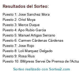 Lista de participantes: Merce Duque, Jose Rojo, Agrupació Socialista de Vilassar, Vidal Diaz Perez, Restaurante Bar Cordoba, Gloria Muñoz, Cristina Bocanegra Cardenas, Manuel Artigas Serrano, Carlos Antolin Sanchez, Gloria Garcia Sanchez, Loli Marquez Delgado, Bartomeu Ramos Ruiz, Oriol Moya, Apo Rubio Garcia, Rosa Rius, Antonio Granados Cano, BMpress Servei De Premsa de l'Actualitat, Josep Baez Roura, Paco Aguilera Puga, Carmen Cárdenas Cárdenas, Teodoro Valverde Delgado, Jose Sanchez Mora.