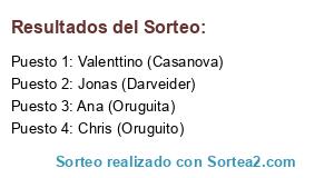 Lista de participantes: Chris (Oruguito), Valenttino (Casanova), Ana (Oruguita), Jonas (Darveider).