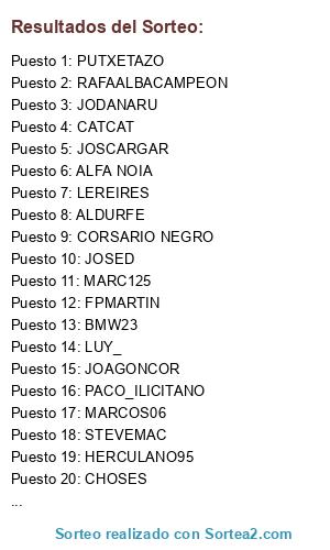 Lista de participantes: ---ZUMBON, JOSCARGAR, DEALER, ALDURFE, LUY_, PACO_ILICITANO, XUS_AL91, FPMARTIN, MARCOS06, JOSED, BYRONCETE, LEREIRES, OSANDIE, TITOROBERT69, PIRLIN, PUTXETAZO, BMW23, XESCO, JAVI2012, MANU, HERCULANO95, RICLA, JOAGONCOR, INAUSKI, CATCAT, RAFAALBACAMPEON, JODANARU, PELAGARTO, LP_6, PAPILLON, CORSARIO NEGRO, MARC125, STEVEMAC, ALFA NOIA, CHOSES, JAVILONN.