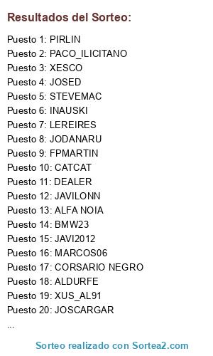 Lista de participantes: JOSED, OSANDIE, DEALER, JOSCARGAR, FPMARTIN, XUS_AL91, ---ZUMBON, ALDURFE, PACO_ILICITANO, XESCO, MARC125, MARCOS06, LEREIRES, PIRLIN, TITOROBERT69, JODANARU, HERCULANO95, JAVI2012, BMW23, LUY_, PUTXETAZO, PELAGARTO, STEVEMAC, BYRONCETE, CHOSES, CATCAT, MANU, ALFA NOIA, RICLA, JOAGONCOR, LP_6, INAUSKI, CORSARIO NEGRO, RAFAALBACAMPEON, PAPILLON, JAVILONN.