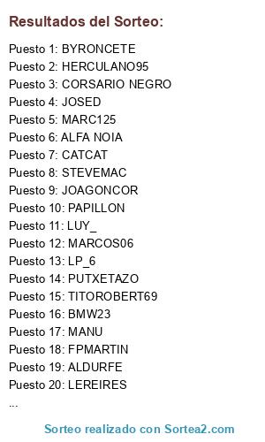 Lista de participantes: JOSCARGAR, XUS_AL91, JOSED, ---ZUMBON, PELAGARTO, FPMARTIN, MANU, OSANDIE, XESCO, PACO_ILICITANO, DEALER, ALDURFE, LP_6, MARC125, PUTXETAZO, JODANARU, BYRONCETE, TITOROBERT69, CHOSES, PIRLIN, LUY_, MARCOS06, LEREIRES, RICLA, HERCULANO95, STEVEMAC, BMW23, CORSARIO NEGRO, CATCAT, JAVI2012, JOAGONCOR, RAFAALBACAMPEON, INAUSKI, ALFA NOIA, JAVILONN, PAPILLON.