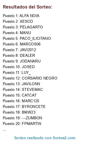 Lista de participantes: PUTXETAZO, LP_6, JOSCARGAR, PELAGARTO, XESCO, MANU, DEALER, XUS_AL91, MARC125, ALDURFE, LEREIRES, BYRONCETE, CORSARIO NEGRO, ALFA NOIA, JODANARU, ---ZUMBON, OSANDIE, RAFAALBACAMPEON, FPMARTIN, CHOSES, STEVEMAC, LUY_, PIRLIN, TITOROBERT69, PACO_ILICITANO, RICLA, BMW23, MARCOS06, JAVI2012, JOAGONCOR, INAUSKI, HERCULANO95, CATCAT, JOSED, JAVILONN, PAPILLON.