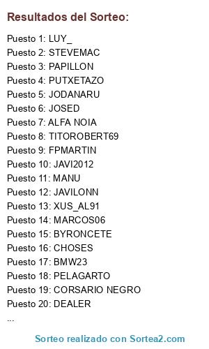 Lista de participantes: RAFAALBACAMPEON, JOSCARGAR, ---ZUMBON, FPMARTIN, OSANDIE, JODANARU, BYRONCETE, XESCO, TITOROBERT69, PACO_ILICITANO, LP_6, RICLA, JAVI2012, PELAGARTO, XUS_AL91, HERCULANO95, LUY_, MANU, INAUSKI, JOAGONCOR, ALDURFE, CORSARIO NEGRO, PUTXETAZO, JOSED, MARCOS06, CATCAT, STEVEMAC, BMW23, CHOSES, JAVILONN, DEALER, PIRLIN, ALFA NOIA, PAPILLON, MARC125, LEREIRES.