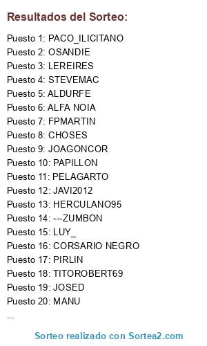 Lista de participantes: JOSCARGAR, XUS_AL91, OSANDIE, ---ZUMBON, FPMARTIN, JOSED, LP_6, XESCO, BYRONCETE, MANU, JODANARU, CHOSES, DEALER, PUTXETAZO, PELAGARTO, MARCOS06, PACO_ILICITANO, ALDURFE, TITOROBERT69, CATCAT, MARC125, RICLA, JOAGONCOR, LEREIRES, RAFAALBACAMPEON, LUY_, CORSARIO NEGRO, INAUSKI, BMW23, STEVEMAC, JAVI2012, PIRLIN, ALFA NOIA, HERCULANO95, PAPILLON, JAVILONN.