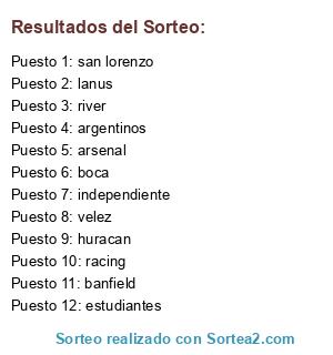 Lista de participantes: river, boca, racing, independiente, san lorenzo , huracan, estudiantes, velez, lanus, banfield, argentinos, arsenal.