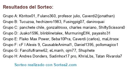 Lista de participantes: Kbritox01, hechizero1983, blinblinetalex, Fulano360, cF l Alexis 9, Fancifulframe62, Fusingpig07, ShiftyScissors0, Tucuzoa, ojm77, Tatan Rivarola7, Seba10Pra, daniroquai, MurmuringElf4, pollomagico1, Flako Max Power, Sadinhox17 pro, eLmanh, CausableAnimal1, Daniel1395, charles mariano, Shuphete, KhrisLbs, gonzalitroxx, maLitroox, payasito31, Juako1596, Andres Donders, Caverdi (carlos), Caverdi2(jonathan), profesor julio, panchete chile.