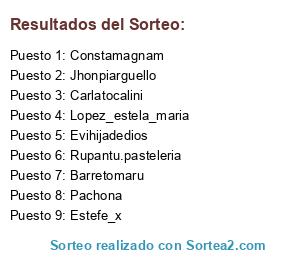 Lista de participantes: Sandravelazquez2107, Emesolb, Vivianalescano5878, Susana.maio, Orii.munoz, Carlatocalini, Lopez_estela_maria, Rupantu.pasteleria, Barretomaru, Pablo.ivan.92, Constamagnam, Lukmartiin, Lukasverges_, Larrosarossana, Pachona, Estefe_x, Pao_perez57, Esteframireze, Jhonpiarguello, Nicogro87, Evihijadedios.