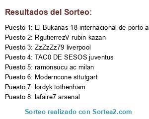 Lista de participantes: TAC0 DE SESOS juventus, ramonsucu ac milan, Moderncone sttutgart, RgutierrezV rubin kazan, lordyk tothenham, lafaire7 arsenal, El Bukanas 18 internacional de porto alegre, ZzZzZz79 liverpool.