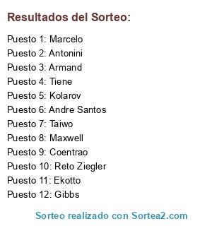 Lista de participantes: Armand, Ekotto, Marcelo, Maxwell, Reto Ziegler, Coentrao, Gibbs, Tiene, Kolarov, Taiwo, Andre Santos, Antonini.
