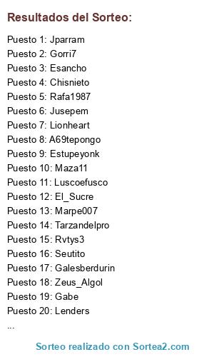 Lista de participantes: Vanmamm, Marpe007, Maza11, Perello, Xernovil, Chisnieto, Rvtys3, Andoni, Xxgutixx, Javiergarcia7, Juanma_10, Zenitramm, Luscoefusco, Tarzandelpro, Exon_Toga, Zeus_Algol, Lionheart, Sergioherasmartin, Siboga, Jusepem, Estupeyonk, Seutito, Lenders, Gorri7, Davies19951995, El_Sucre, A69tepongo, Esancho, Jparram, Gabe, Betikozel, Franmeister, Galesberdurin, Rafa1987, Zanarkanz, Saxoman.