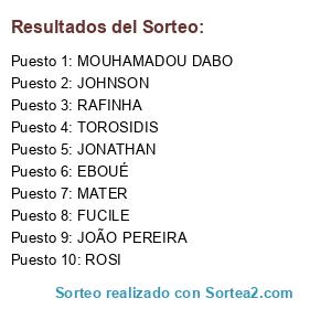 Lista de participantes: ROSI, JOÃO PEREIRA, JONATHAN, RAFINHA, EBOUÉ, TOROSIDIS, MOUHAMADOU DABO, MATER, JOHNSON, FUCILE.