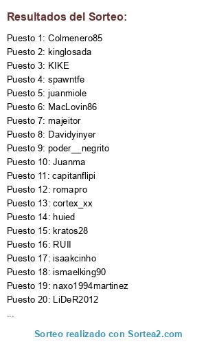 Lista de participantes: LiDeR2012, Davidyinyer, Colmenero85, romapro, kratos28, majeitor, poder__negrito, MacLovin86, Juanma, capitanflipi, ismaelking90, cortex_xx, huied, juanmiole, Rafuka_666, kinglosada, spawntfe, YERAI, RUII, KIKE, naxo1994martinez, isaakcinho.