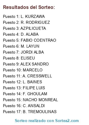 Lista de participantes: MARCELO, JORDI ALBA, D. ALABA, FILIPE LUIS, L. BAINES, R. RODRIGUEZ, ELISEU, ALEX SANDRO, AZPILICUETA, C. ANSALDI, NACHO MONREAL, B. TREMOULINAS, FABIO COENTRAO, M. LAYUN, F. GHOULAM, L. KURZAWA, A. CRESSWELL.