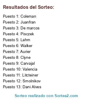Lista de participantes: Lahm, Carvajal, Dani Alves, Juanfran, Litcteiner, Pisczek, Aurier, Walker, Valencia, Clyne, Coleman, De marcos, Smolnikov.