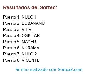 Lista de participantes: BUBANANU, KURAMA, MAYER, VICENTE, OSKITAR, VIERI, NULO 1, NULO 2.